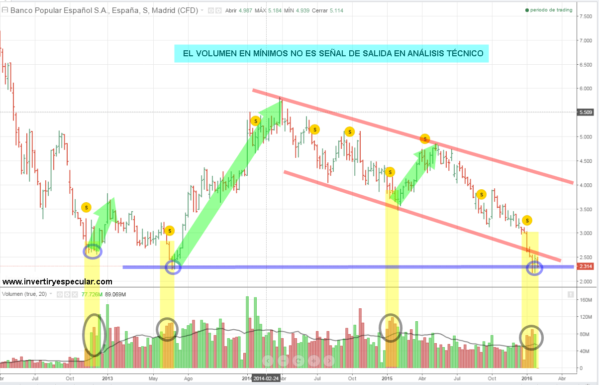 Banco Popular: Si hay algo que nos gusta es ver volumen en mínimos relevantes y si son históricos mejor, tanto se respeten como si no. Para nosotros el peligro está en que se llegue a ellos o se rompan y el volumen no aparezca entonces si tenemos lío si estamos metidos en ellos porque es señal de que los inversores ni venden ni compran sino que dejan estar y claro, si no hay liquidez se sigue bajando por simplemente a nadie gustarle el activo en cuestión tanto por si mismo, como por su sector como por el mercado, da igual, cae porque no se compra y no porque lo estén vendiendo.