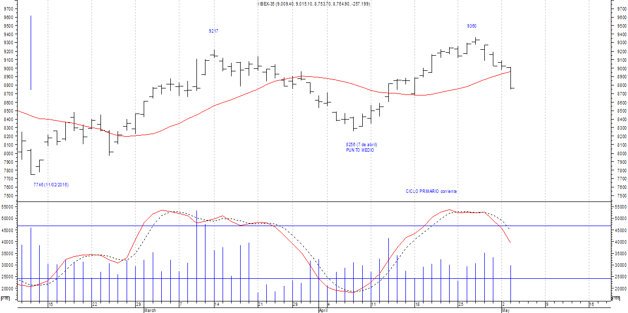 Formación de dos crestas dentro de la segunda mitad del ciclo, la primera ya vista en los 9360 puntos y la segunda podría definirla dentro de la segunda mitad de mayo; sin entrar en la calidad de la segunda cresta que podría quedar por encima o por debajo de 9360.