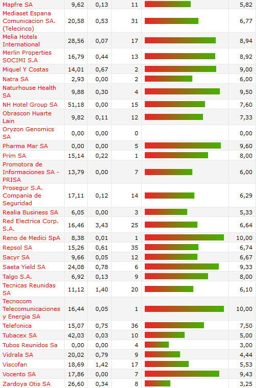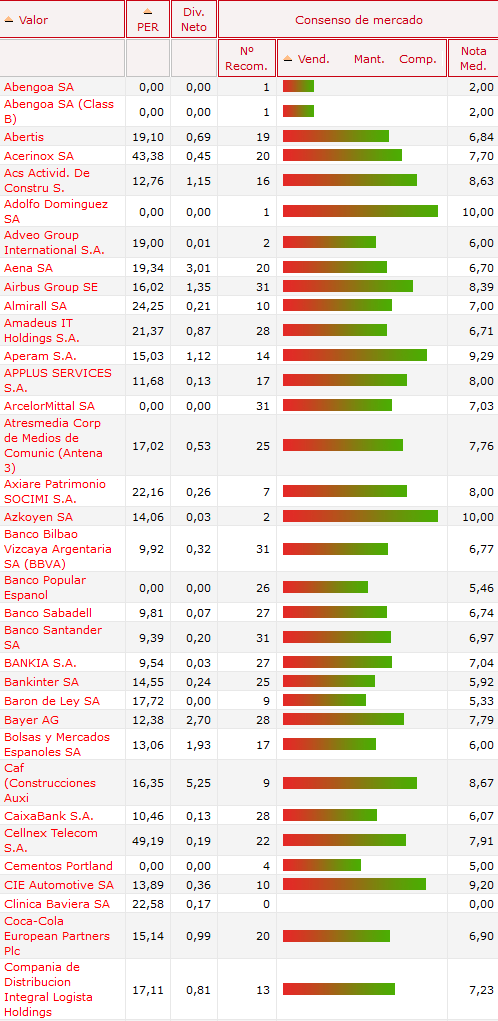 Consenso de mercado. Ranking de las principales recomendaciones de los brokers de todos los valores del Mercado Continuo Español. PER, dividendo, nota media.