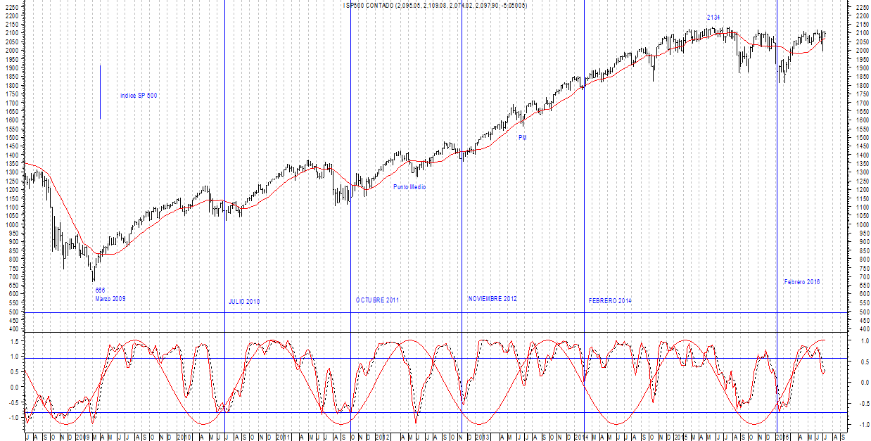 La clave vendrá dada por la cresta del ciclo de 6 años (representa la resistencia), solo superándola (2134) se pondría de manifiesto el inicio en febrero de un nuevo ciclo de 18 meses dentro de un nuevo ciclo de 6 años.