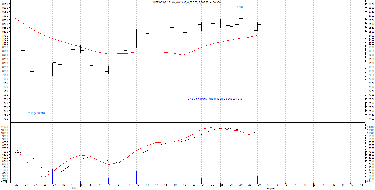 El índice IBEX entra en su sexta semana, sigue definiendo un lateral, representa un fuerte soporte desde donde podría rebotar de inmediato e ir una cresta por encima de los 8720 puntos.
