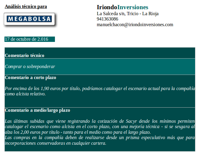 Flash técnico Sacyr. Comentario técnico, a corto plazo y a medio/largo plazo. Chart explicativo.