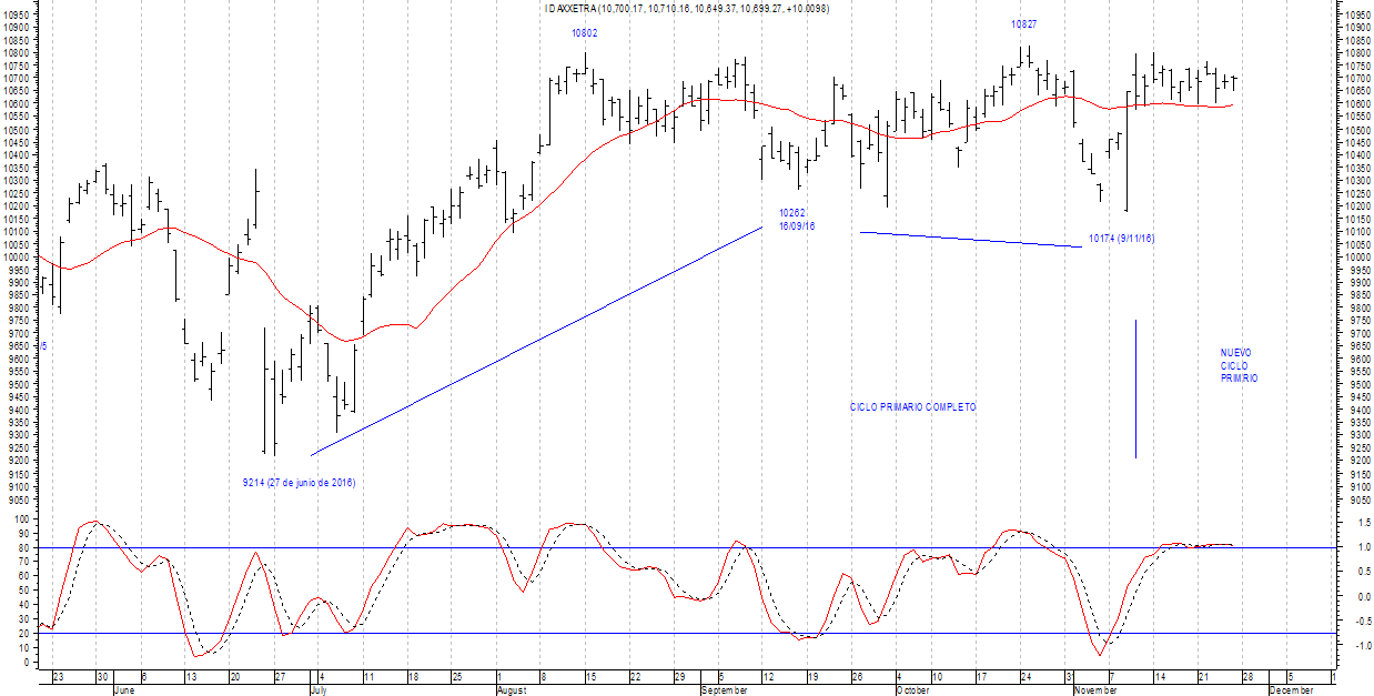 El nuevo ciclo desde 9 de noviembre entra en su cuarta semana, va desplegando un lateral por encima de su media móvil 18, halla fuerte resistencia a elevarse a nuevos máximos, no obstante hay que tener en cuenta que el recorte que se esperaba como final del viejo ciclo tuvo mucho que desear.