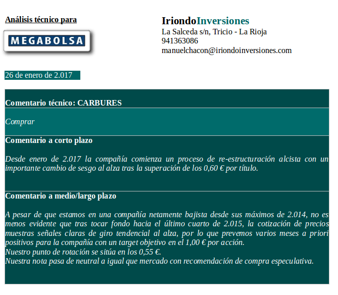 El departamento técnico de Iriondoinversiones analiza desde un punto de vista técnico Carbures: recomendación de compra.