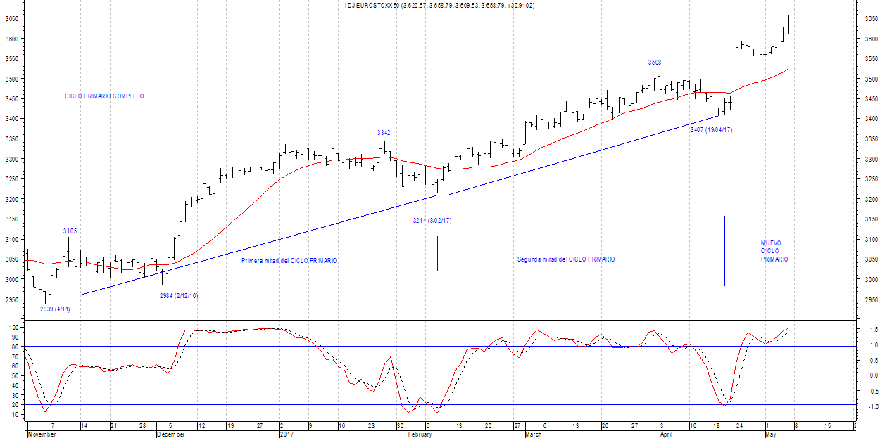 El impulso alcista en los últimos días ya cotizaba la victoria de Macron en las elecciones francesas, quizás ahora se dé aquello de comprar con el rumor y vender con la noticia, sin embargo y tal como viene desplegando el Ciclo Natural la tendencia principal es alcista.