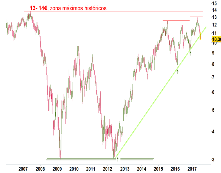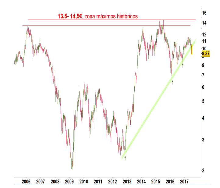 Pierde, nada menos que, la tendencia alcista que nace en los mínimos de 2012, que a su vez se corresponde con la tendencia alcista surgida en los mínimos de 2015. Además los máximos previos en 13 euros se sitúan cerca de la zona de máximos históricos del valor (13-14 euros)