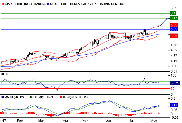 Asimismo, la acción se sitúa por encima de su media móvil de 20 y 50 días (se sitúa a 5.58 y 5.41 respectivamente).