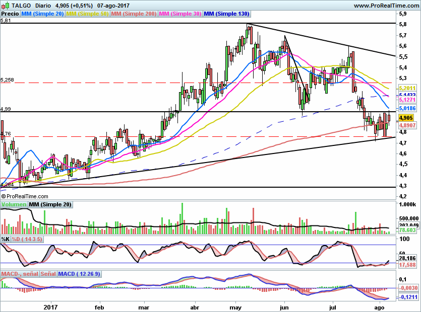 En las ultimas sesiones la corrección ha encontrado suelo en la zona de 4,76€ y ahora el precio intenta reaccionar al alza aunque no consigue recuperar la zona de 5€.