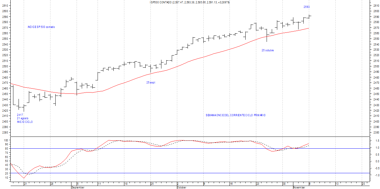 Ciclo desplegando desde 21 de agosto, máximos y mínimos crecientes, cresta de momento en los 2593 puntos.