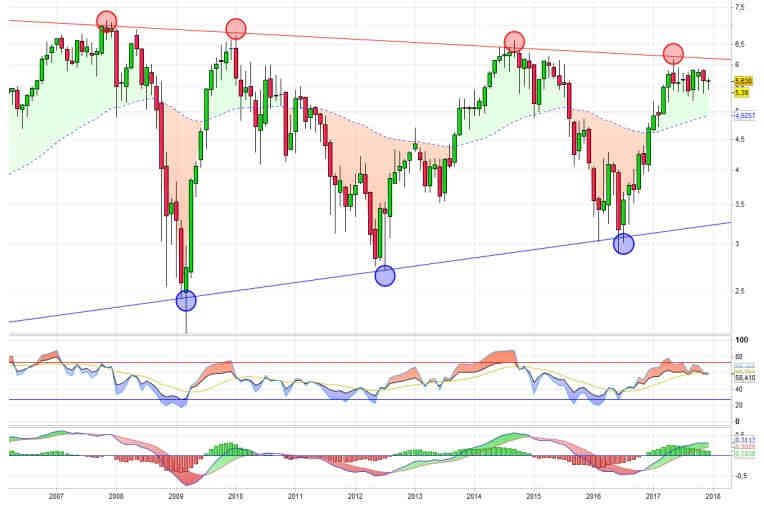 El gráfico de largo plazo es un aviso a navegantes, para rebasar la resitencia que encuentra en la zona de los 6 € se van a necesitar «horas de pico y pala»