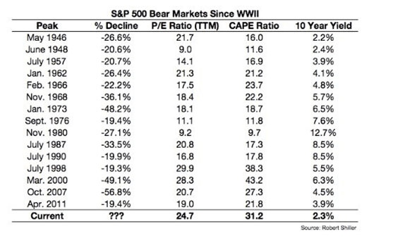 Por mis cuentas, ha habido 15 mercados bajistas desde la Segunda Guerra Mundial para el S&P 500. Eso significa que ha habido un mercado bajista cada cinco años en los últimos más de 70 años. Las valoraciones fueron elevadas en muchos de los picos de mercado que precedieron a estas caídas, pero no en todas. Eche un vistazo a cada mercado bajista junto con la relación precio/ganancias (PER) a 12 meses, la relación precio/ganancias ajustada cíclicamente de Shiller (CAPE) y el rendimiento del Tesoro a 10 años: