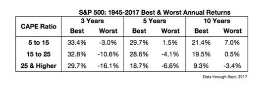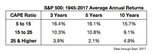 Aunque no existe una relación clara entre un colapso del mercado y los niveles de valoración, existe un fuerte vínculo entre una valoración inicial y los rendimientos posteriores. La siguiente tabla muestra un rango de las proporciones iniciales de CAPE junto con las rentabilidades anuales promedio de tres, cinco y 10 años del S&P 500 desde 1945: