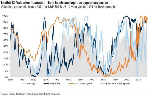 En el estudio inferior de Goldman de largo plazo, los ratios se antojan excesivamente exagerados, tanto en bolsas como en bonos.