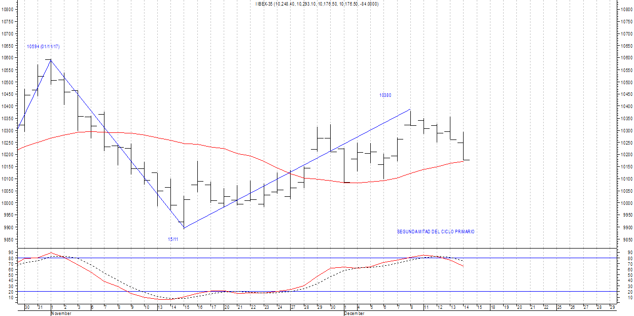 Según el ciclo avanzado (boletín septiembre) una onda se inició el 15 de noviembre prolongable hasta mediados de diciembre, ese supuesto contemplaba máximos y mínimos crecientes hasta la cresta de onda  (10380) a la que seguiría recorte.