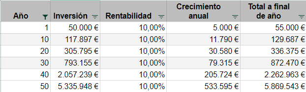 Por ejemplo, si invertimos 50.000€, obtenemos una rentabilidad anual del 10% y reinvertimos los beneficios pasados 10, 20, 30, 40 y 50 años tendremos el siguiente patrimonio: