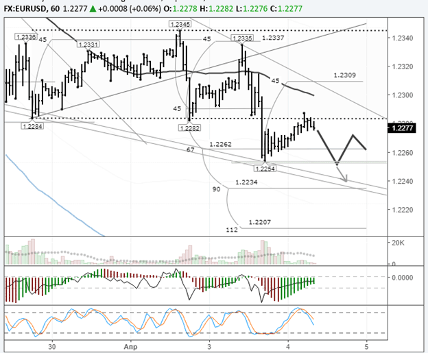 El martes 3 de abril, la negociación del par euro/dólar cerró a la baja. Los patrones diarios formaron dos jornadas similares en el mercado (02.04 y 03.04), aunque las mismas difieren en los eventos. Durante la sesión europea, los compradores actualizaron el mínimo de la sesión y luego replantearon sus propios mínimos. Y el martes, la tasa del euro saltó a 1.2335 y desde allí colapsó a 1.2254 (-81 puntos).