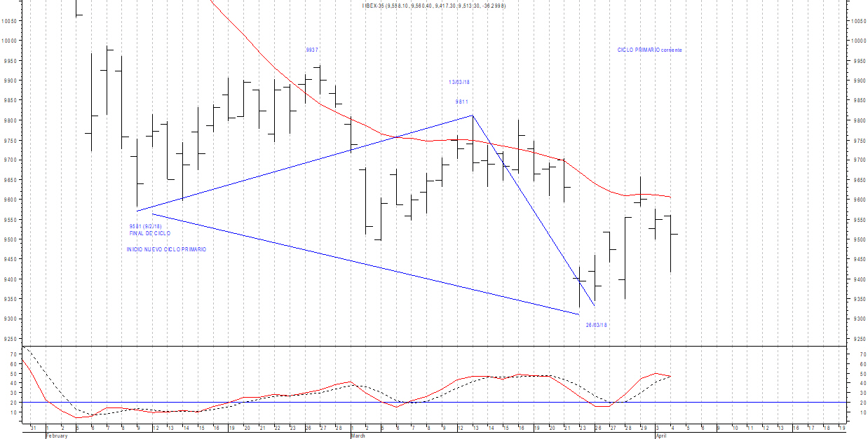 La primera fase de ciclo, desde 9 de febrero, ha definido cresta en 9937 puntos y soporte el 26 de marzo.