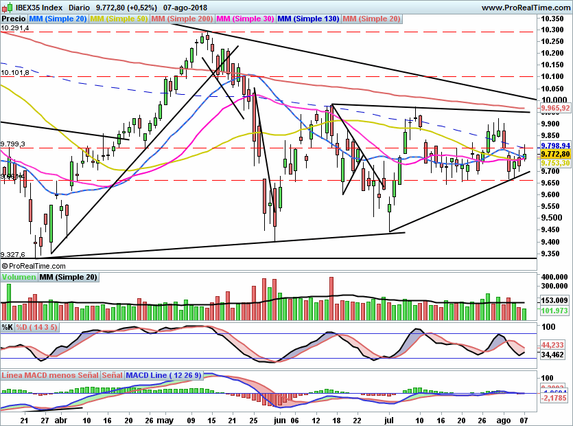 El comienzo de sesión fue positivo, sin embargo la falta de volumen no ha permitido al precio superar en cierres la zona de 9800, un nivel que a priori permitiría escalar hacia 9960/10000 puntos.