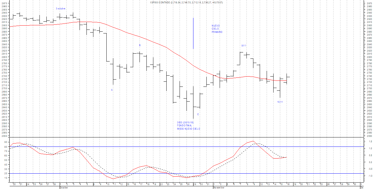 Cuarta semana del ciclo, definiendo primera onda (dentro de la primera mitad de ciclo), cresta de onda el 8 de noviembre, tiende al soporte de onda (un primer movimiento el día 15, suficiente aunque cabe volver a probarlo)