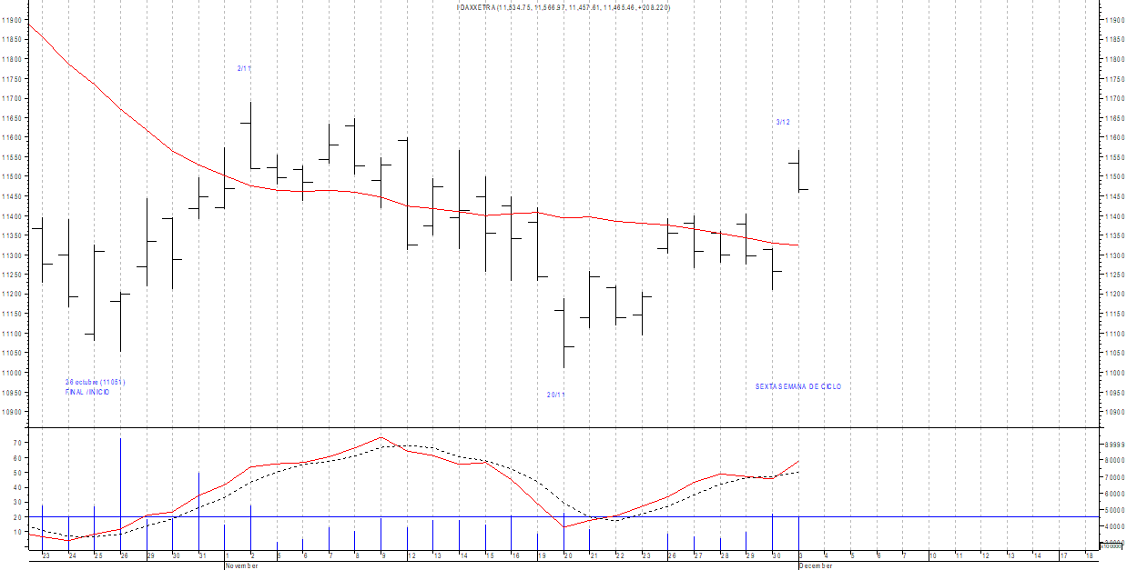 Cabe una formación de onda intermedia a mediados de diciembre (seguidores del 5ª boletín: se desprendería del indicador Parabolic SAR en el gráfico Ciclo Natural Avanzado; también del triángulo formado por los puntos 26/10, 26/11 y 17/12)