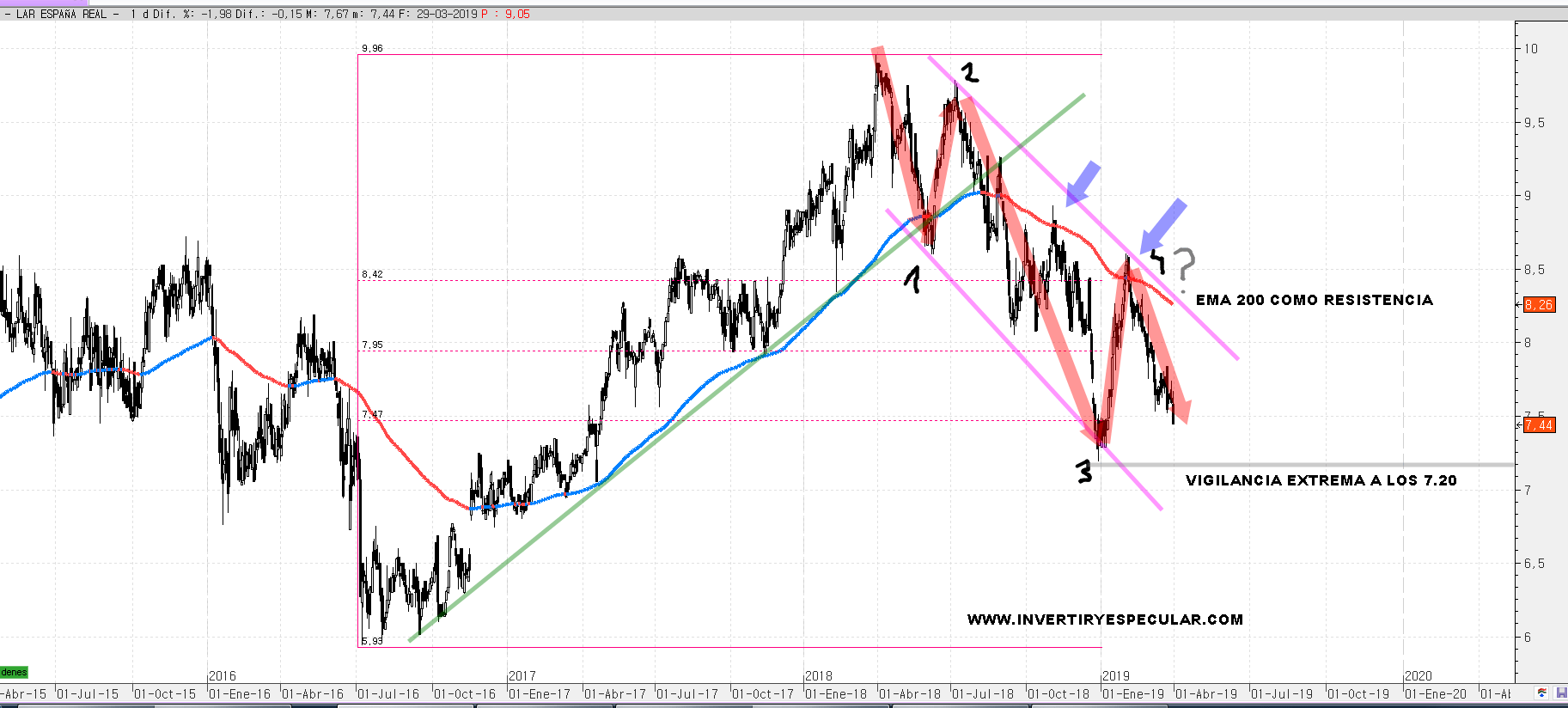 LAR España. De nuevo la EMA 200 ejerció de resistencia y le dió una buena patada bajista tirándola en vertical casi a mínimos de diciembre. El sector SOCIMI está muy tocado y salvo alguna honrosa excepción es para evitarlo por el momento aunque veamos sus cotizaciones muy sugerentes o seductoras para entrar porque lo que demuestran es mucha debilidad. Tampoco lo entiendo del todo porque si los tipos no van a subir en la eurozona eso al sector no le viene mal, tanto porque quienes no tienen vivienda pueden comprar como los inversores que tienen dinero también para alquilar.