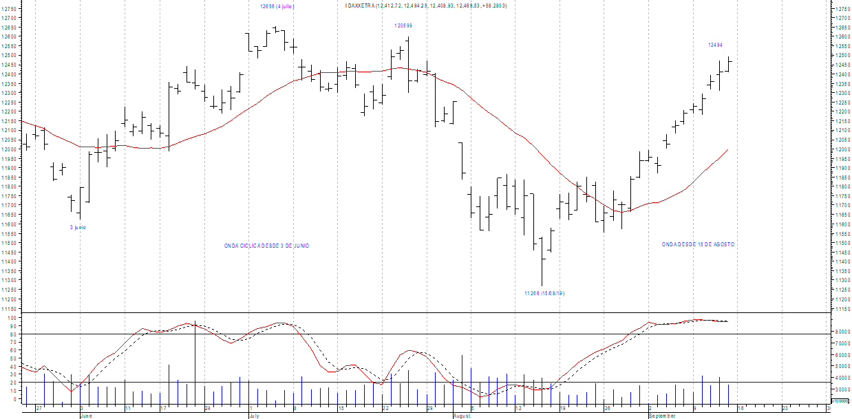La segunda onda (desde 15 de agosto) transita su QUINTA semana, cresta de momento en los 12494 puntos del día 13/9, cabe algún recorte, no obstante la tendencia principal del ciclo (a corto) aún permitiría ir a probar la resistencia 12599, dentro de la segunda mitad de septiembre.