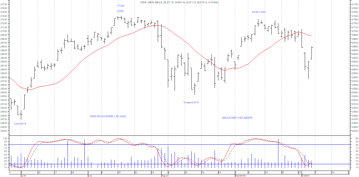 Semana DIECINUEVE desde 3 de junio (inicio de un ciclo que proyecta hasta la 2ª mitad de octubre) cresta de la primera onda en los 27398 puntos con final el 15 de agosto.