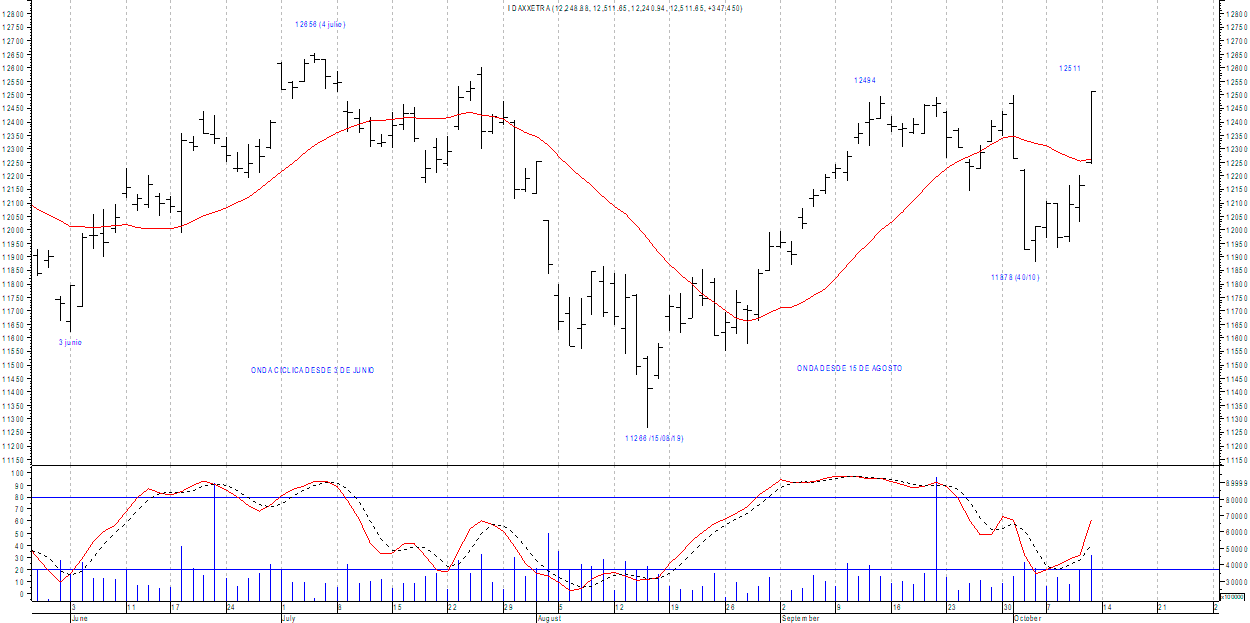 Ciclo desde 3 de junio que en principio proyectaba hasta la 2ª mitad de octubre pero quizás haya cerrado, cresta de la primera onda en los 12656 puntos con final el 15 de agosto.