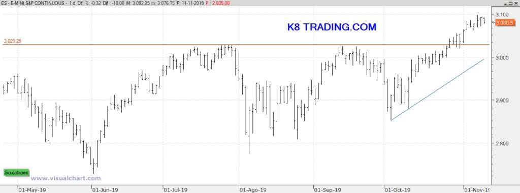 En K8 venimos comentando que esa zona situada entre los 3.100 y los 3.200 puntos sería de fuerte techo. De momento, parece que lo han parado pero el sesgo sigue alcista y creemos que es pronto para cortos y tarde para las compras.