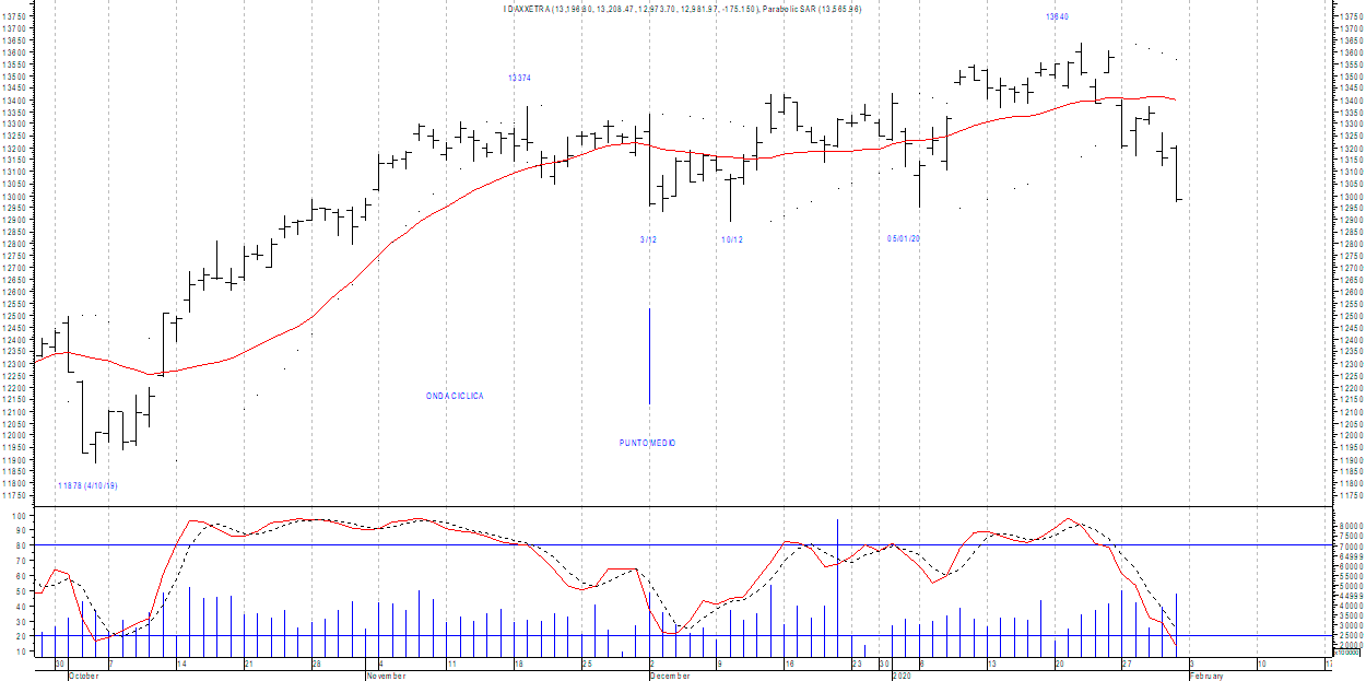 La onda o fase corriente va desplegando desde el día 3 de diciembre con cresta en los 13640 puntos, definitiva dado el recorte habido y ratificado por el oscilador stochastic.