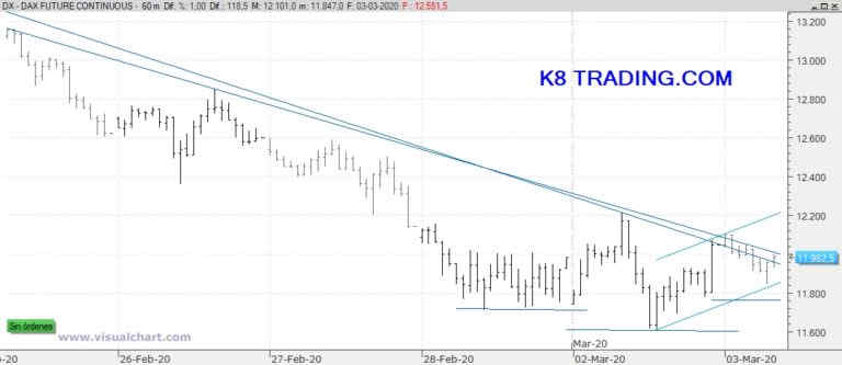 Lo que hizo ayer el Dax puede ser una vela envolvente que podría ser de giro al menos en el corto plazo. Si nos fijamos en el gráfico horario adjunto, vemos como también puede estar formando una figura de hombro-cabeza-hombro invertido siendo los mínimos del día 28 de febrero el hombro izquierdo, los mínimos de ayer la cabeza y los mínimos de hoy el hombro derecho. Sin embargo, a pesar de posibles rebotes, vemos como la tendencia es muy bajista en el corto plazo y en K8 Trading no nos fiamos de las posiciones alcistas.