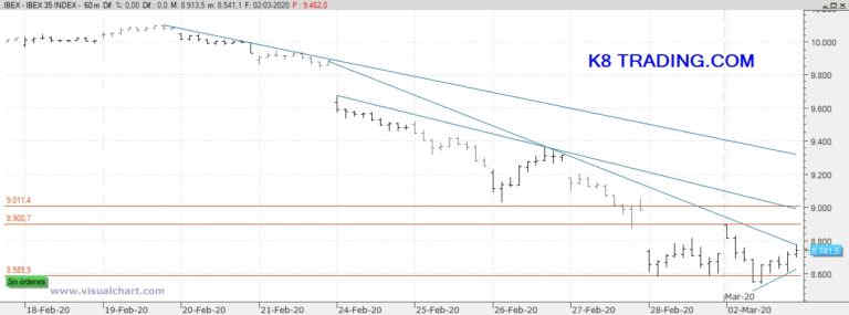 Por arriba, vemos 3 líneas de tendencia bajista dibujadas en el gráfico horario. La primera parece que será superada en la apertura y la segunda pasa ligeramente por debajo de los 9.000 puntos. La tercera ya se sitúa en los 9.300 puntos aproximadamente.