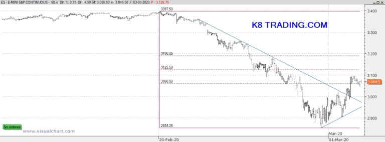 En K8 Trading creemos que seguirá rebotando algo más pero no nos fiamos nada de las posiciones alcistas y preferimos esperar a que suban para entrar bajistas, probablemente cerca de los 3.190 si es que llegan. Estos momentos de mercado son delicados pues los rangos son amplios y la velocidad extrema, hay que ir con mucho cuidado y muchas veces no merece la pena estar dentro hasta que no se calme un poco la situación. Lo iremos siguiendo en nuestras sesiones de trading en vivo, pero por el momento, creemos que lo mejor es operativa intradía y con menos cantidad de lo habitual, incluso mantenerse al margen hasta que acabe el rebote y podamos volver a entrar bajistas.