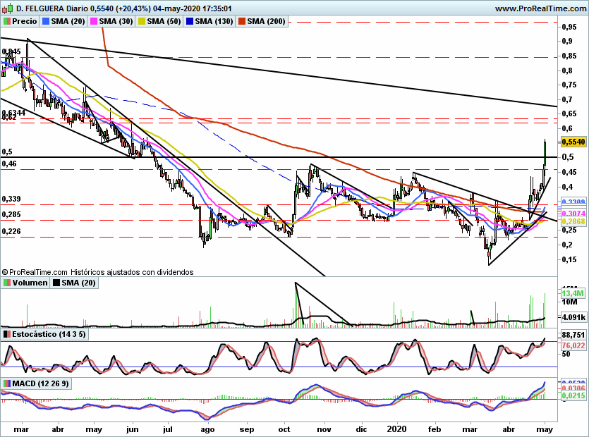 Pese al pesimismo del mercado y un inicio bajista la compañía ha logrado superar la resistencia de 0,46/0,50€ , un movimiento que podría calificarse de cambio de tendencia de medio plazo.