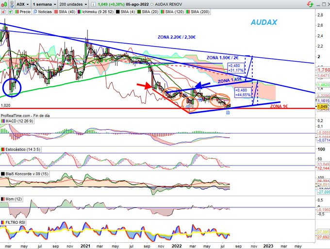 Semanal. Nueva semana respetando canal reestructuración alcista en seguimiento alta volatilidad con doble soporte 1,03€ y 1€ cuya clave alcista pasa por perforación zona medias móviles ahora por 1,22€ (alta) para movimiento a techo 1,45€, zona clave cierre cortos.