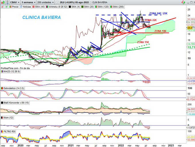 Semanal. Ultimas 3 semanas dudas sobre directriz alcista de corto plazo en momento subida libre que mientras mantenga precio sobre soporte 18€ presenta su principal reto en la resistencia de los máximos recientes, zona 24€/25€, por indicadores aun falta.