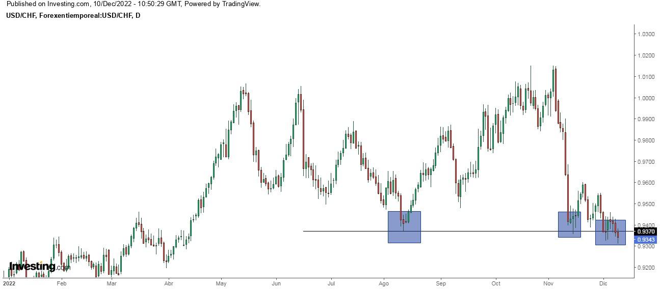 USD/CHF se encuentra en un momento clave. El soporte formado el pasado mes de agosto fue puesto a prueba el 15 de noviembre y evitó más caídas. Pero en diciembre lo volvió a tocar y no está siendo capaz de rebotar. En las próximas semanas o meses entraría dentro de lo “normal” que lo perdiese.