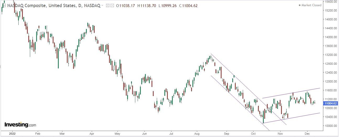 * El Nasdaq Composite lleva ya 265 sesiones sin registrar un nuevo máximo de cierre diario,  lo que supone la racha más larga desde la que terminó en agosto del año 2016. El endurecimiento de la política monetaria de la Reserva Federal mediante fuertes subidas de tipos de interés afecta sobre todo al sector de las compañías tecnológicas.