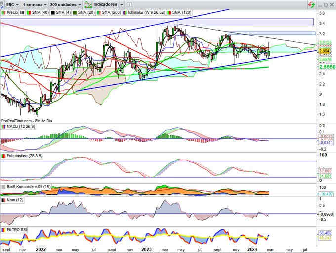 2,864€, +2,87% esta semana. Buena para el valor y en alta volatilidad por sesión jueves, en la que presentó resultados en línea con esperado y buenas expectativas 2024, vela confirmación soporte tendencial y también perforación puntual resistencia por 2,94€. Alcista.