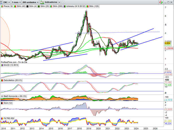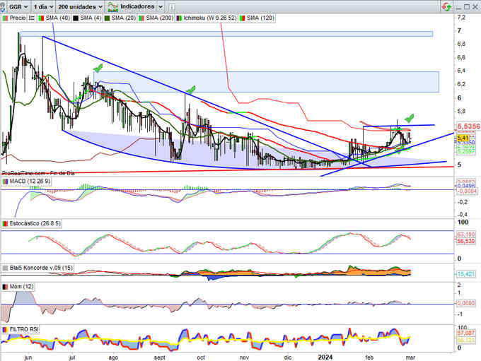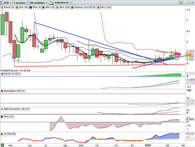 En Gráfico Semanal Media Móvil 40 pasa por la zona de los 5,49€. Sigue alcista.