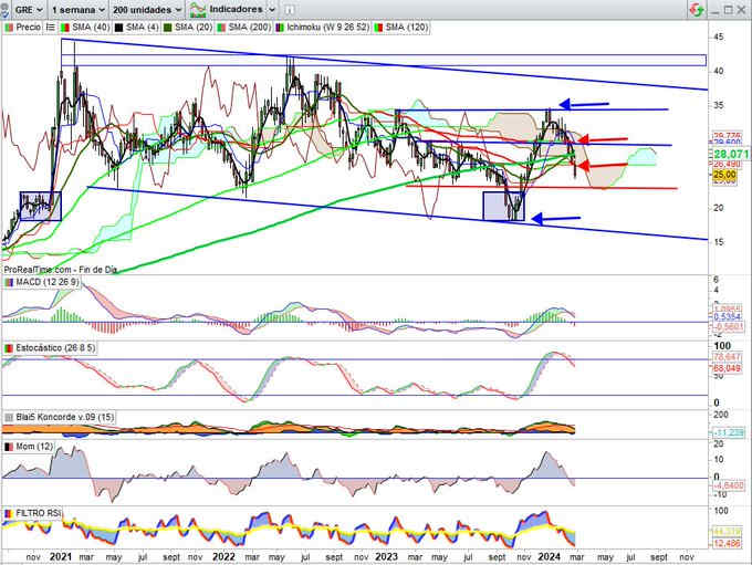 25€, -6,58% esta semana. Publicando buenos resultados, pero siguiendo tendencia corto plazo mientras siguen plan recompra acciones cada vez mas baratas, apunta a soporte zona 23€ tras barrer la de 28€ y la de 26,50€.