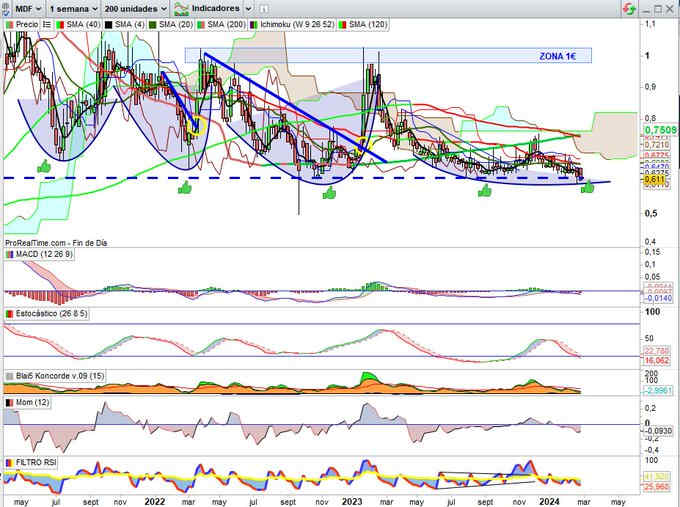 0,611€, -1,77% esta semana. Sigue sobre soporte zona 0,60€ tras finalización ampliación capital entrada inversores referenciada a 0,76€.