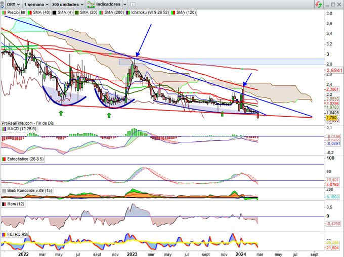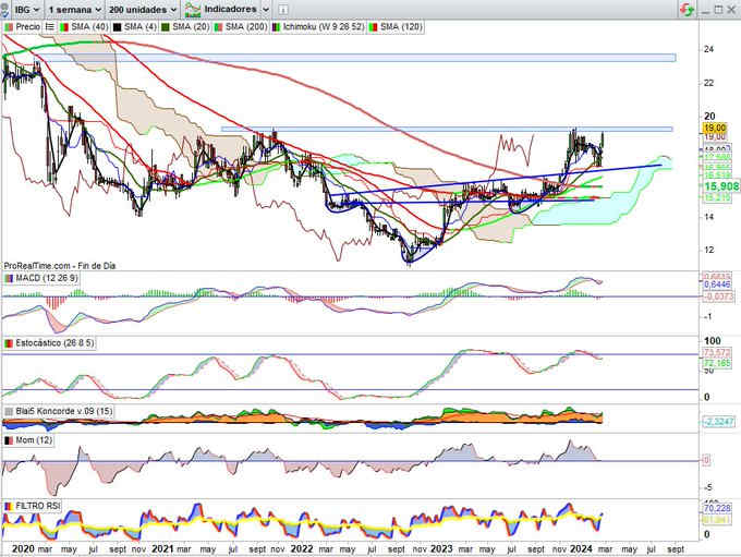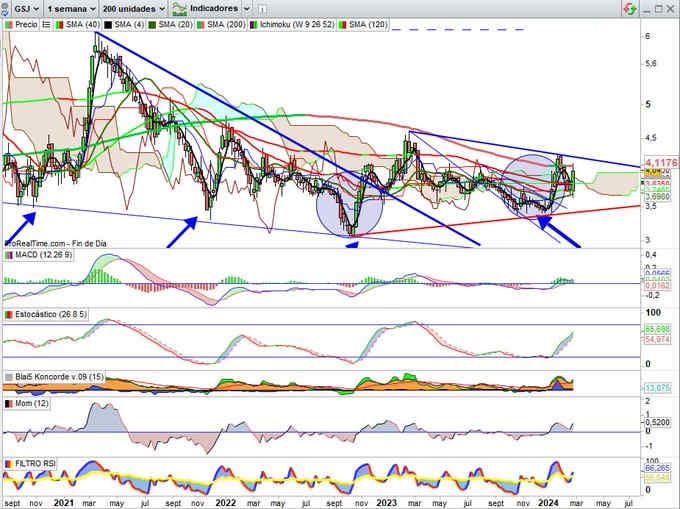 4,04€, +7,16% esta semana. Buenos resultados del 2023 en todas líneas, y responde desde primera zona soporte propuesta con vela envolvente alcista para volver a probar resistencia máximos recientes por 4,27€. Indicadores en sugerencia alcista.