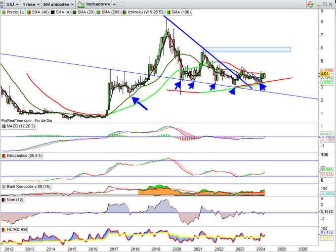 En gráfico mensual media móvil de 40 pasa por 4,10€.