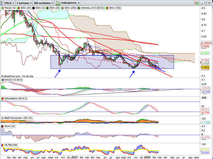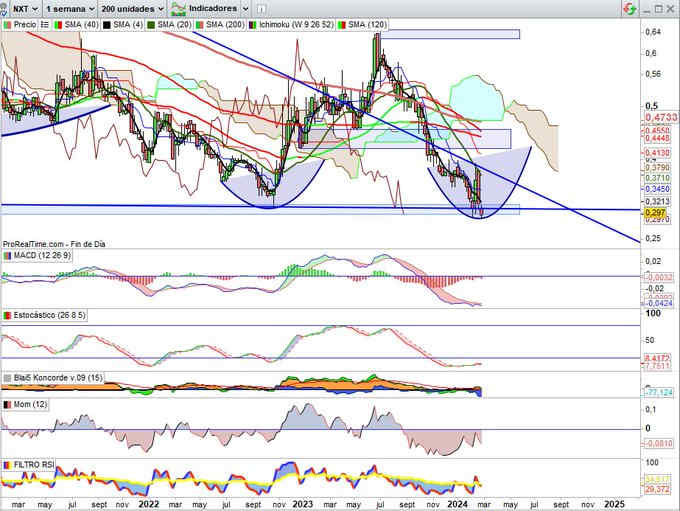 0,297€, -6,31% esta semana. Confirmando vuelta a zona soporte del planteamiento doble suelo en la espera de resultados esperando ver si comunica extraordinarios venta EEUU.