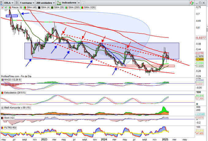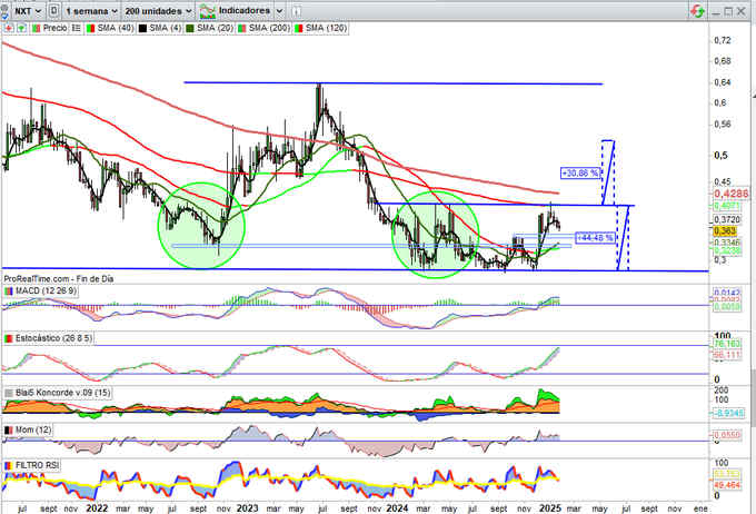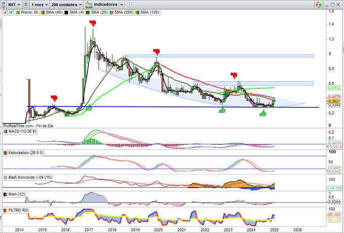 En el corto plazo no descartaría ya rearme alcista potencial estructura cambio de tendencia en cuanto esta se confirme definitivamente, bajo mi punto de vista será sobre la zona de los 0,37€ por acción, toda vez consiga los apoyos de la zona de soporte en los 0,33€ que bajo mi punto de vista fueron ya determinantes como nivel clave comentado desde su momento, vuelva o no ya a poner en prueba y pendientes de comunicados en la CNMV sobre Máximos Accionistas que confirmen ya comentados en actual momento técnico y fundamental, algunos de ellos relevantes y catalizadores alcistas que espero se confirmen en corto plazo.