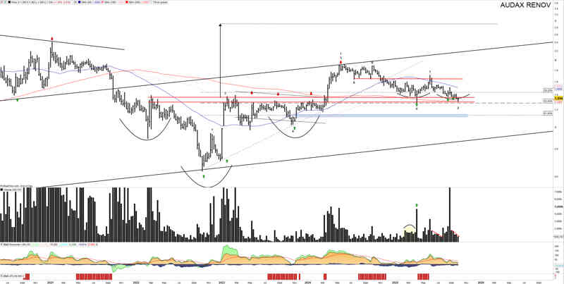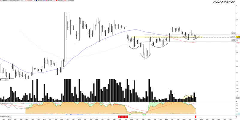 Sigue aguantando zona 1,30€, zona soporte clave, donde veremos si logra construir ese potencial doble suelo o por el contrario atacar GAP y nivel 61% de Fibonacci en 1,12€.