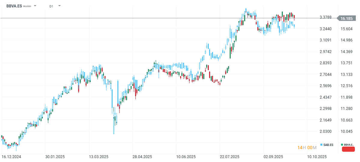 Las acciones de BBVA (velas verdes y rojas) suben un 73% en este 2025, mientras que Sabadell (velas azules y blancas) sube un 75%.