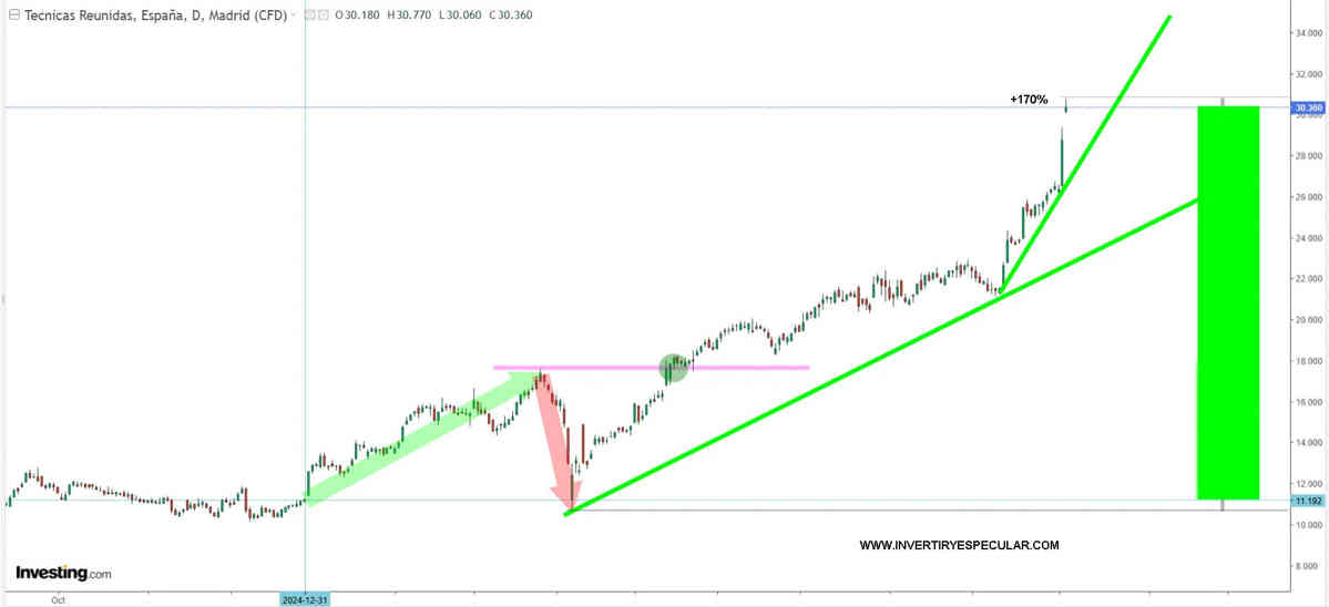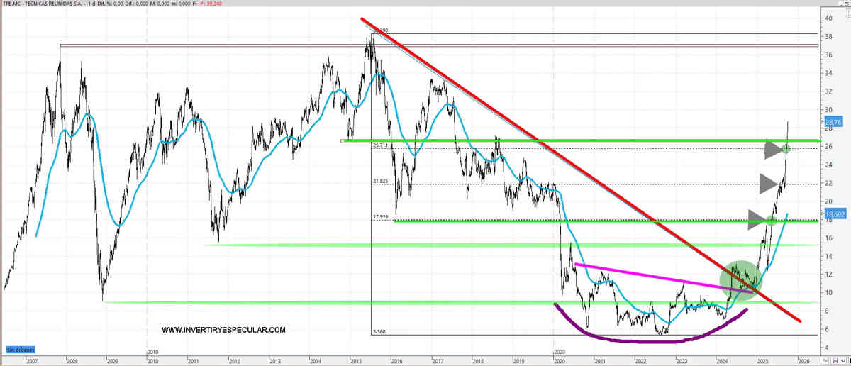 Y la segunda es agua que no has de beber déjala correr, si no entraste más abajo a la rotura de 10-12 euros, los 15 euros incluso los 18 euros ¿que vas a hacer comprar a poco menos de 30 euros? con esto no queremos decir que su subida está agotada ni mucho menos, simplemente que Técnicas Reunidas ha perdido mucho potencial alcista porque ya lo ha recorrido.