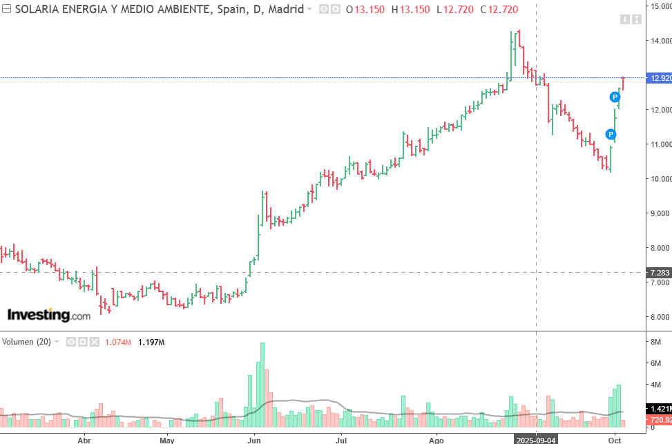 • Solaria ha conseguido liderar varias sesiones del Ibex 35 tras la doble noticia de resultados sólidos y programa de recompras, acelerando el repunte del precio en las últimas semanas.